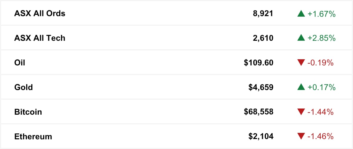 ASX as at market close. Commodities and crypto in USD.